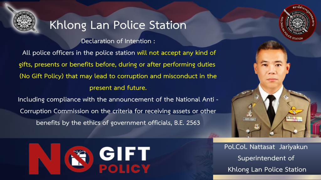 พ.ต.อ.ณัฐศักดิ์  จริยคุณ ผกก.สภ.คลองลาน  ร่วมกับข้าราชการตำรวจในสังกัดรณรงค์ต่อต้านการทุจริตคอร์รัปชั่น ทุกรูปแบบ และต่อต้านการรับสินบน (Anti-Bribery Policy) และการ ไม่รับของขวัญ ของกํานัล หรือประโยชน์อื่นใด (No Gift Policy) จากการปฏิบัติหน้าที่