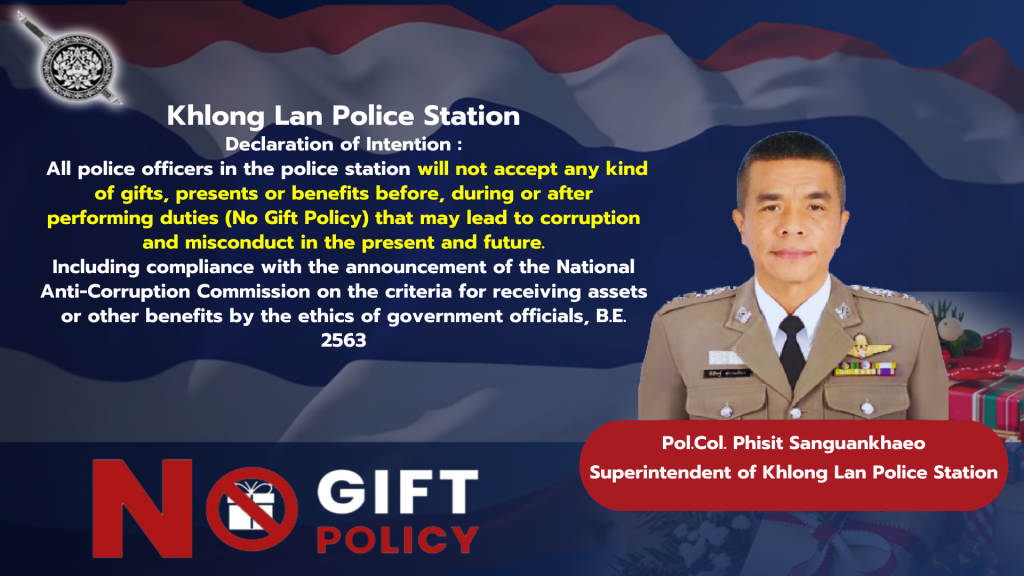 พ.ต.อ.พิสิษฐ์ สงวนเขียว ผกก.สภ.คลองลาน  ร่วมกับข้าราชการตำรวจในสังกัดรณรงค์ต่อต้านการทุจริตคอร์รัปชั่น ทุกรูปแบบ และต่อต้านการรับสินบน (Anti-Bribery Policy) และการ ไม่รับของขวัญ ของกํานัล หรือประโยชน์อื่นใด (No Gift Policy) จากการปฏิบัติหน้าที่